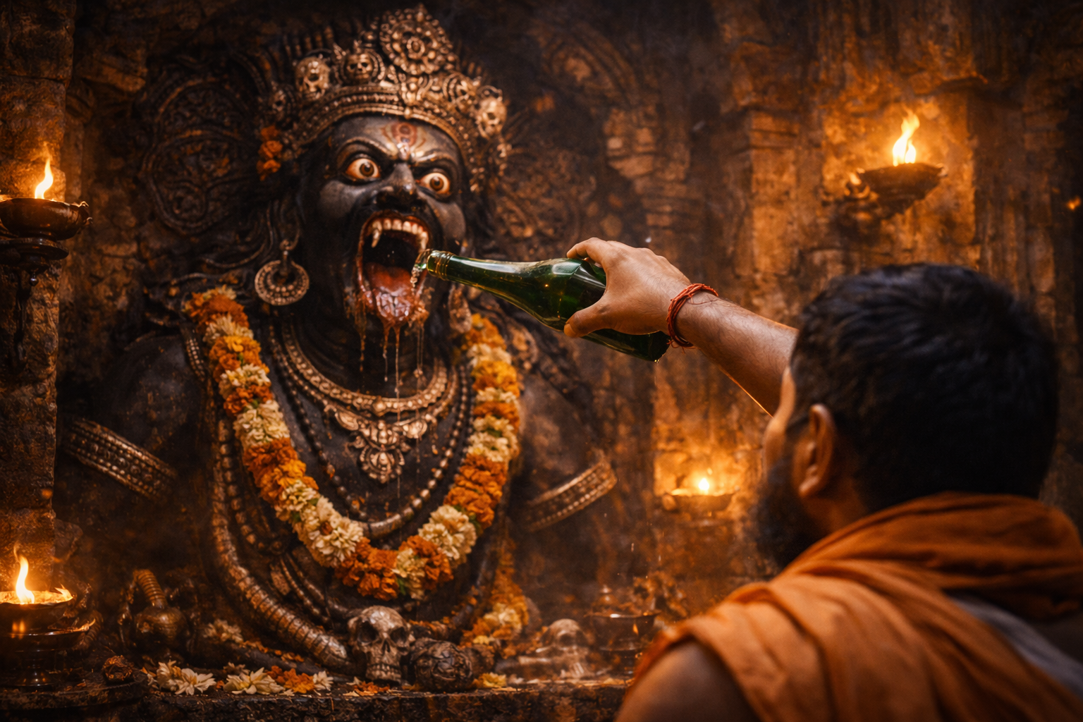 కాల భైరవ ఆలయంలో భక్తులు సమర్పించిన మద్యం విగ్రహం పెదవుల దగ్గర పెట్టగానే నెమ్మదిగా మాయమవుతుంది. ఇది భక్తుల విశ్వాసం ప్రకారం దేవుడు స్వీకరిస్తాడని నమ్ముతారు, అయితే శాస్త్రీయ వివరణ ఇంకా స్పష్టంగా లేదు.