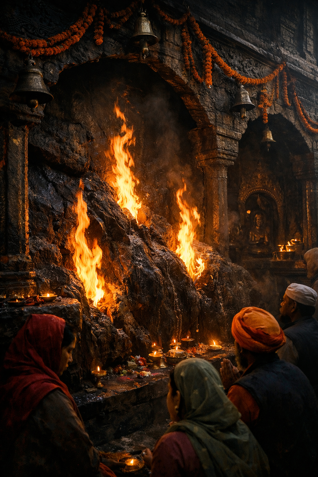 శతాబ్దాలుగా ఎటువంటి ఇంధనం లేకుండానే సహజంగా ఇక్కడ ఒక జ్వాలా అలా ఎగసిపడుతూనే ఉంటుంది. ఈ జ్వాల ఎప్పటికీ ఆరదు. ఇలా ఒకటి కాదు తొమ్మిది జ్వాలలు ఆలయంలో మండుతూనే ఉంటాయి. ఐతే ఎందుకు ఇలా జ్వాలలు ఎలా ఎగసిపడతాయో సైంటిస్టులు కూడా కనుక్కోలేకపోయారు. ఈ ఆలయాన్ని రాజు భూమ్ చంద్ నిర్మించాడు. భూమిచంద్ అమ్మవారి ఆజ్ఞ మేరకు ఈ ఆలయాన్ని సంప్రదాయ శైలిలో నిర్మించారు. ఆలయ గర్భగుడిలో తొమ్మిది జ్వాలలు నిరంతరం మండుతూనే ఉన్నాయి. గర్భగుడి పైన ఒక అందమైన బంగారు గోపురం ఉంది. చుట్టుపక్కల ప్రశాంతమైన వాతావరణం ఆధ్యాత్మిక అనుభూతిని కలిగిస్తుంది.