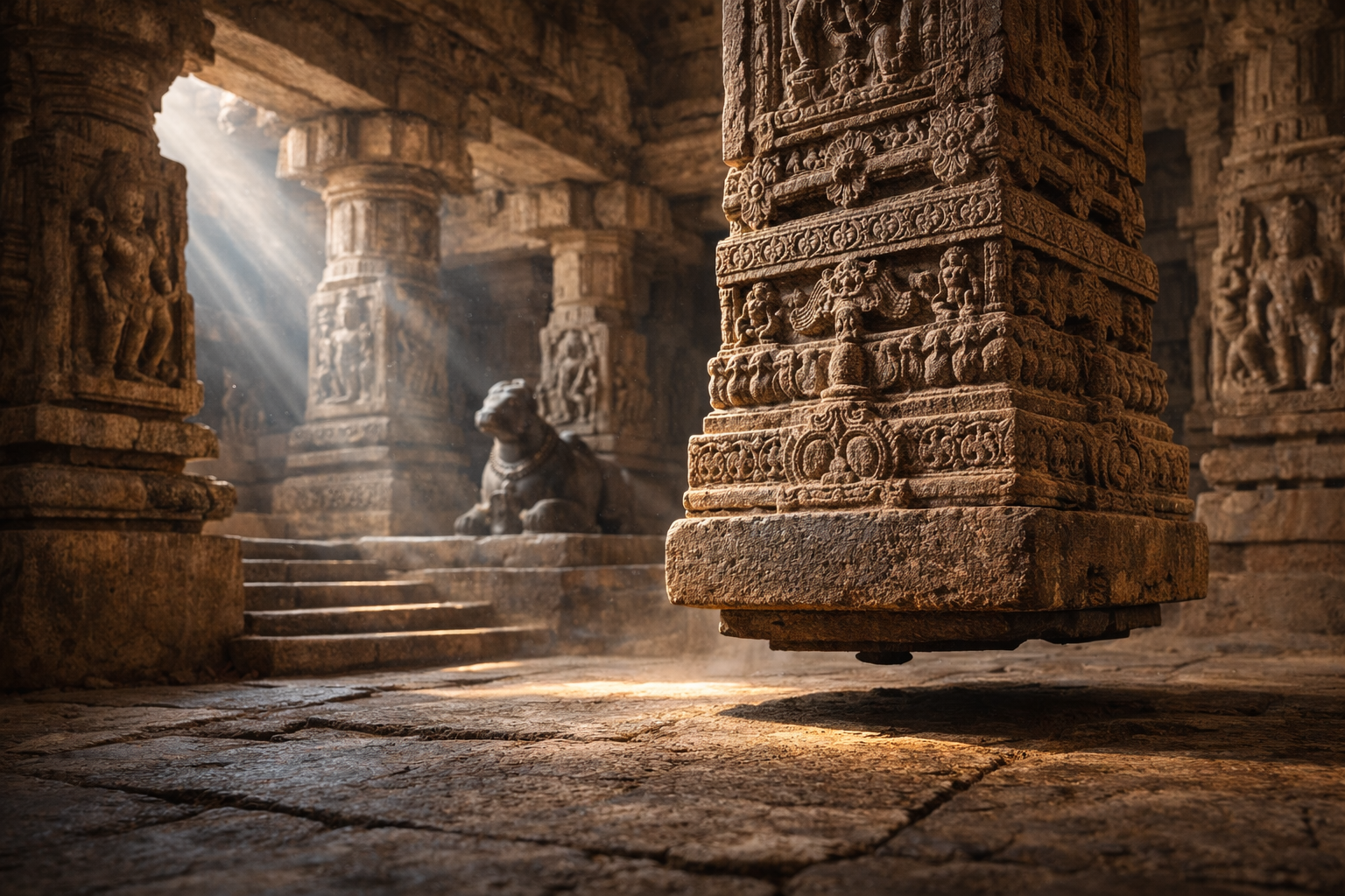 ఈ ఆలయంలో మొత్తం 70 స్తంభాలు ఉన్నాయి. అయితే 👉 ఒక స్తంభం మాత్రం భూమిని తాకకుండా గాల్లో వేలాడుతూ ఉంటుంది. ఈ స్తంభం కింద ఒక పలుచని గుడ్డను కూడా సులభంగా తీసుకెళ్లవచ్చు. స్తంభం భూమిని తాకదు. గాలిలో వేలాడుతున్నత్తుగా ఉంటుంది. దీనిని వేలాడే స్తంభం అని పిలుస్తారు. ఇది శిల్పకళలో ఒక రహస్య అద్భుతంగా కనిపిస్తుంది.