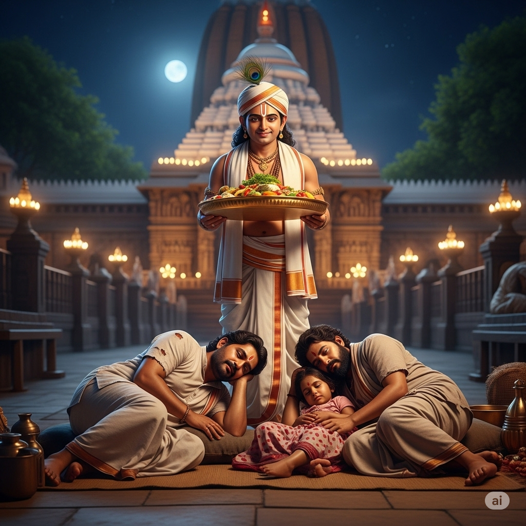 ఇక్కడ జగన్నాథ స్వామి తన భక్తుడు ఏమీ తినకుండా, ఆకలితో నిద్రపోతున్నాడని చాలా ఆందోళన చెందాడు. నా స్నేహితుడు చాలా దూరం నుండి వచ్చాడు. అతనికి ఆహారం పెట్టకుండా నేను ప్రశాంతంగా ఎలా నిద్రపోగలను? ఈ సమయంలో నా సహాయం కోరుతూ నేనే అతని ఏకైక స్నేహితుడిని అని అనుకుని అతను ఇక్కడికి వచ్చాడు. అలాంటపుడు నా స్నేహితుడు ఆలయం బయట ఆకలితో అలమటిస్తుంటే ఇక్కడ నేనెలా ప్రశాంతంగా ఉండగలను. అనుకున్నాడు.