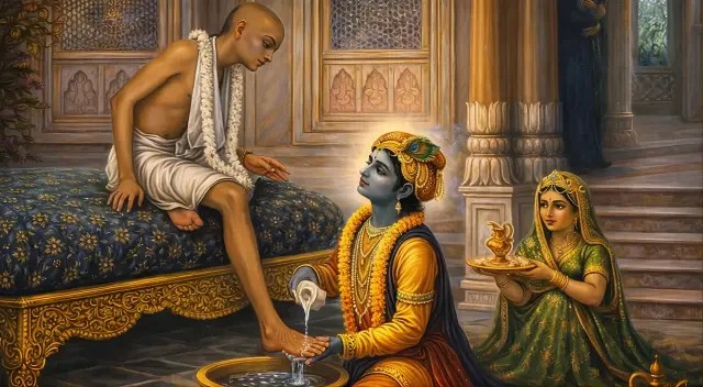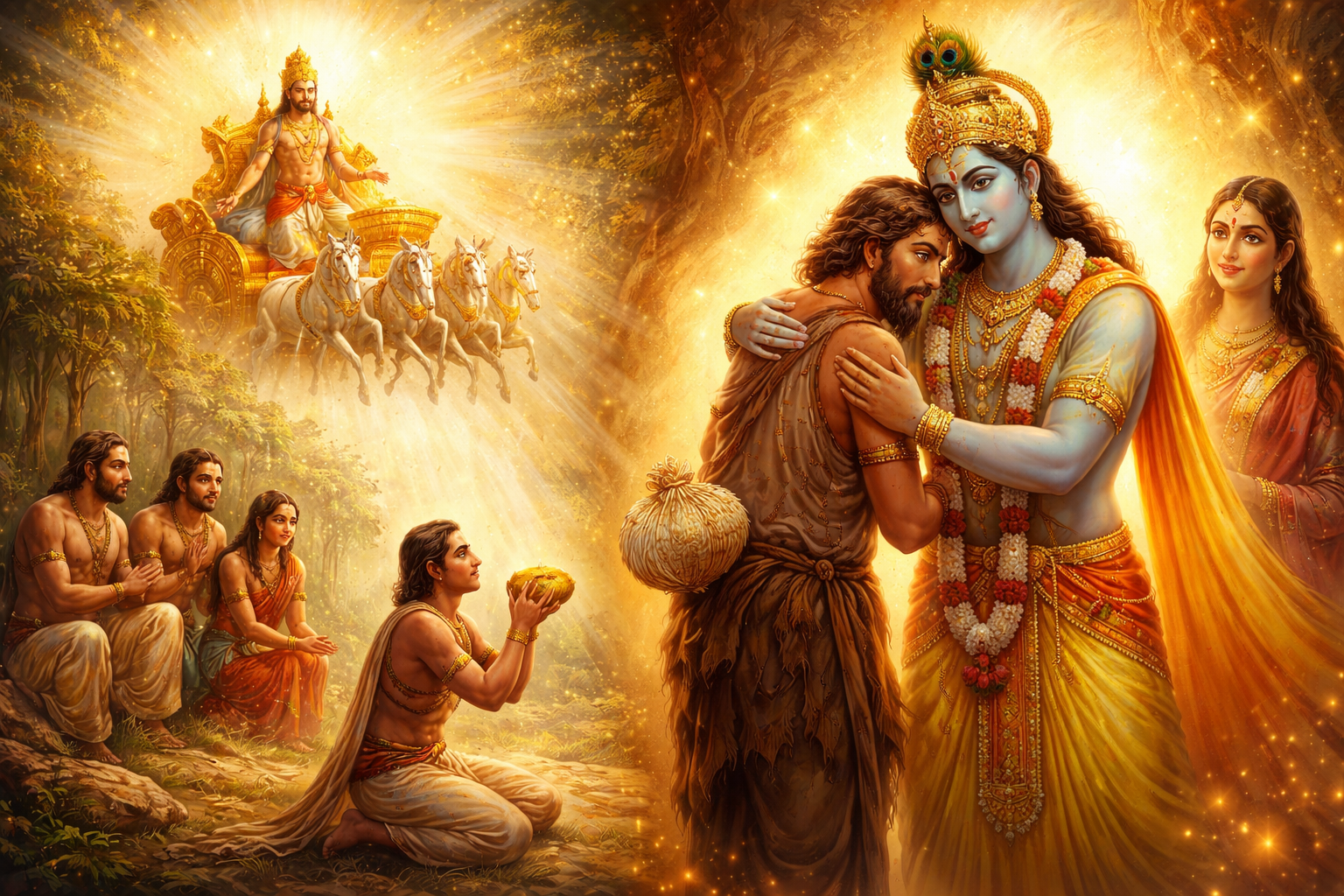 ఎన్నో కష్టాలు పడి సుధాముడు ద్వారకకు చేరుకున్నాడు. ఆ రాజ భవనాల వైభవం చూసి నోటమాట రాలేదు. లోపలికి వెళ్లడానికి సంకోచిస్తుండగా, సుధాముడు వచ్చాడని తెలిసిన శ్రీకృష్ణుడు పరుగు పరుగున వచ్చి తన స్నేహితుడిని కౌగిలించుకున్నాడు. స్వయంగా ఆయన పాదాలు కడిగి, రాజ సింహాసనంపై కూర్చోబెట్టి ఉచారం చేశాడు. పాత కబుర్లన్నీ మాట్లాడుకున్నారు. కృష్ణుడు చిలిపిగా నవ్వుతూ, "మిత్రమా, నాకోసం ఏం తెచ్చావు?" అని అడిగాడు. సుధాముడు సిగ్గుతో, తన పేదరికాన్ని ఎత్తిచూపే ఆ అటుకుల మూటను దాచడానికి ప్రయత్నించాడు. కానీ సర్వాంతర్యామి అయిన కృష్ణుడు ఆ మూటను ప్రేమగా లాక్కొని, ఎంతో ఇష్టంగా ఆ అటుకులను నోట్లో వేసుకున్నాడు. "ఆహా, ఈ అటుకులు ఎంత అమృతంలా ఉన్నాయి!" అంటూ ఒక పిడికెడు తిన్నాడు. రెండో పిడికెడు తినబోతుంటే, రుక్మిణీ దేవి ఆయన చేతిని పట్టుకుని, "స్వామీ, ఒక్క పిడికెడుతోనే మీ స్నేహితుడికి తరగని ఐశ్వర్యాన్ని ఇచ్చారు. రెండోది కూడా తింటే మేమంతా ఆయనకు దాస్యం చేయాల్సి వస్తుందేమో" అని ప్రేమగా వారించింది. సుధాముడు తన పేదరికం గురించి ఏమీ అడగలేకపోయాడు. కృష్ణుడి ఆదరణకు పొంగిపోయి, తిరిగి ఇంటికి బయలుదేరాడు. తీరా వచ్చి చూసేసరికి, తన గుడిసె స్థానంలో ఓ పెద్ద భవనం, సిరిసంపదలు వెల్లివిరుస్తున్నాయి. ఇదంతా కృష్ణ లీల అని గ్రహించాడు. సుధాముడు ప్రేమతో తెచ్చిన అటుకులను కృష్ణుడు స్వీకరించి, ఆయన దారిద్ర్యాన్ని శాశ్వతంగా తొలగించిన ఆ శుభదినం కూడా అక్షయ తృతీయే.