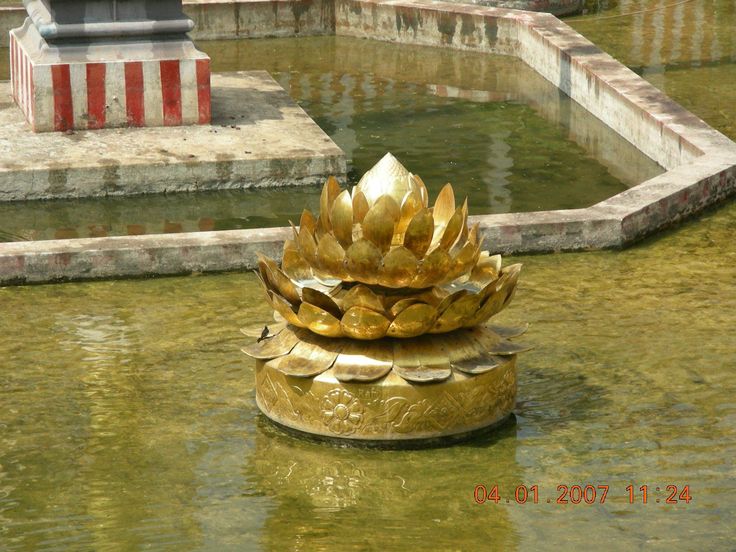 నీరు స్పష్టంగా ఉంటుంది, ఆలయ గోపురాలను, మధ్యలో ఉన్న బంగారు కమల విగ్రహాన్ని ప్రతిబింబిస్తుంది.