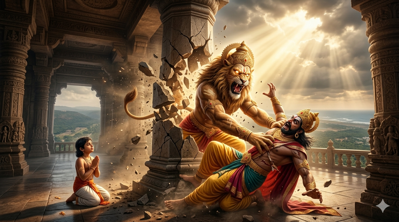 తండ్రి ఎన్ని రకాలుగా బెదిరించినా, ఎంత కఠినంగా శిక్షించినా ప్రహ్లాదుడు 'ఓం నమో నారాయణాయ' అనే మంత్రాన్ని మాత్రం వదల్లేదు. ఏనుగులతో తొక్కించినా, మంటల్లో వేయించినా, కొండపై నుండి తోసేసినా... ప్రతీసారి ఆ శ్రీహరే తన భక్తుడిని కాపాడుతూ వచ్చాడు. చివరికి సహనం నశించిన హిరణ్యకశిపుడు, "అంతటా ఉండే నీ విష్ణువు... ఈ స్తంభంలో ఉన్నాడా?" అని అరుస్తూ, తన గదతో సభలోని ఒక స్తంభాన్ని బలంగా కొట్టాడు.